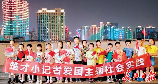 15名楚才小记者都来自常青树实验学校,当晚,他们和家长一起登上横渡长江博物馆楼顶观景平台。这里居高临下,视野开阔,是观看长江灯光秀的黄金地点,也被央视选为直播机位之一。夜空下长江两岸流光溢彩的美景让孩子们欢欣雀跃。夜晚8时许,长江灯光秀亮相,当两岸林立的高楼上跳动出10到70的数字时,孩子们跟着大声喊出来,“40、50、60、70,湖北、武汉!”两岸沿江建筑变身华丽舞台,不断变换着五彩动画,对面绿地中心打出“祖国万岁”“我爱中国”“站起来、富起来、强起来”等字样,江面的知音号游轮上一面巨幅国旗徐徐展开,面对这样恢宏壮丽的场景,孩子和家长们情不自禁地挥舞着小红旗,唱起了《我和我的祖国》《学习雷锋好榜样》《歌唱祖国》等歌曲,他们的歌声、笑容与璀璨的灯光一起被摄进央视记者的镜头中。