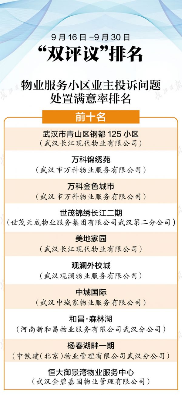 长江日报-长江网10月12日讯(记者杨荣峰)根据武汉市委市政府推动“双评议”向民生领域延伸的工作部署,武汉市住房保障房管局、市商务局、市交通运输局分别组织对物业服务小区、加油站、出租车进行评议。长江日报-长江网记者获悉,相关部门通报了近期评议情况:
