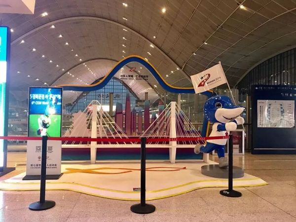 不仅广场变得更亮更美了,进站口、候车室等人流密集区域,广告展位、灯箱、电子显示屏,都在刊播军运会公益广告、宣传片,还设置了军运会文化展示区,浓厚的军运会氛围吸引许多旅客纷纷驻足观看。