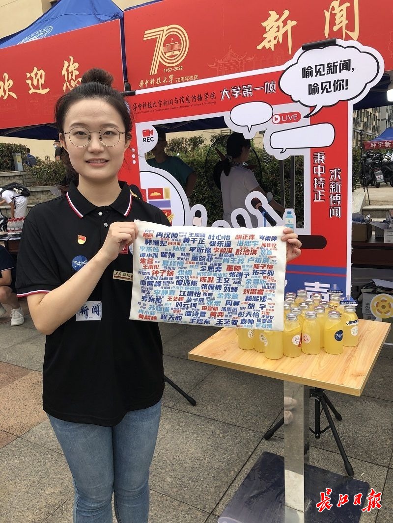 辅导员胡馨月展示给新生定制的帆布袋。记者胡义华 摄