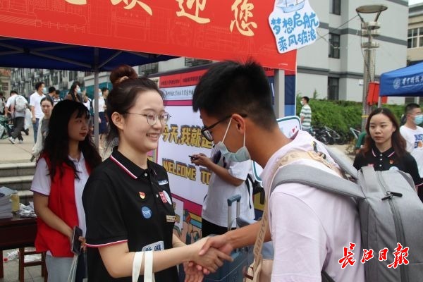 长江日报大武汉客户端8月29日讯 父亲开车12个小时,送孩子来华中科技大学报到。8月29日,在学校见到已经在新生微信群“见过面”的辅导员胡馨月,大一新生张皓晨笑着说:“我们的辅导员好漂亮!”