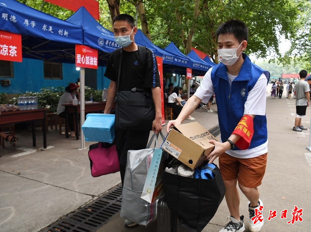 长江日报大武汉客户端8月29日讯 8月29日下午,华中科技大学新生报到首日,来自五湖四海的新生相聚校园,开启人生新篇章。在各个迎新点,身着红马甲和蓝马甲的志愿者主动为新同学搬运行李、热情地引导报名等服务,让新同学感受到新“家”的温暖。(长江日报记者高勇 通讯员高翔 摄影报道)