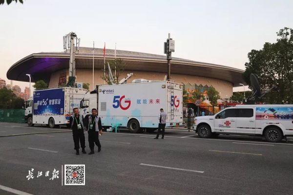 18日下午,在武汉体育中心附近,三大运营商的15台5G应急通信车 长江日报记者杨涛 摄