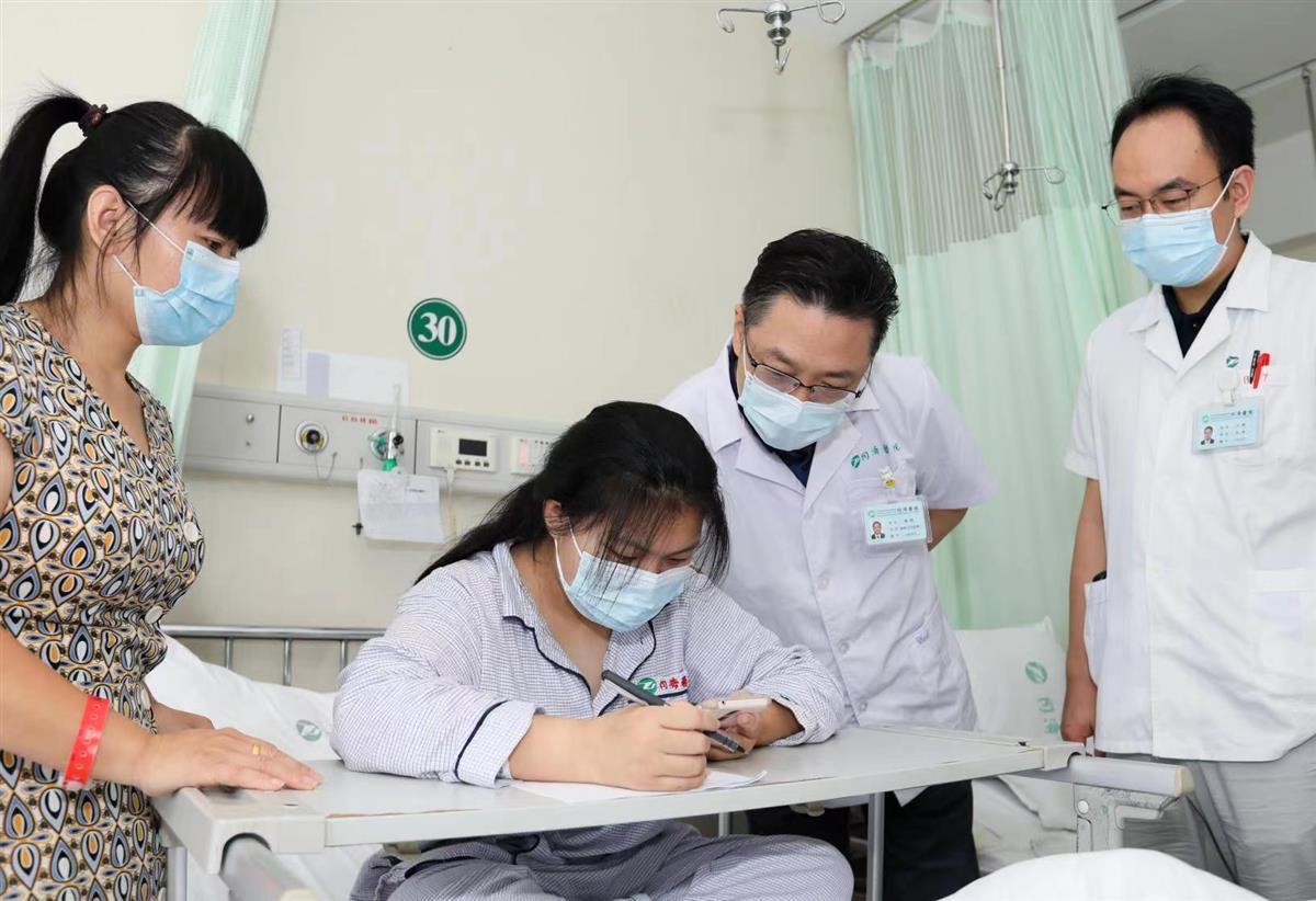 14岁的女孩乐乐术后在病房上网课学习,即将出院。(右二为魏翔教授)