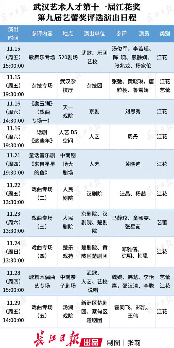 本届“江花奖”“艺蕾奖”评选,将有来自武汉京剧院、武汉汉剧院、武汉楚剧院、武汉人民艺术剧院、武汉歌舞剧院、武汉爱乐乐团、武汉杂技团、武汉说唱团、黄陂区楚剧团、新洲区楚剧团、蔡甸区楚剧团等11个艺术院团及武汉市艺术学校的29位演员参加。11月15日至29日,他们将通过歌舞乐、杂技、戏曲、话剧、童话音乐剧、歌舞木偶曲艺等10场评选演出亮相,最终评选出10个“江花奖”、4个“艺蕾奖”。