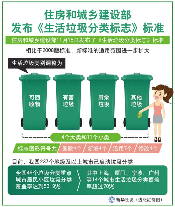 长江日报-长江网11月18日讯 日前,住房和城乡建设部发布了《生活垃圾分类标志》标准。本次修订的标准,将生活垃圾类别调整为可回收物、有害垃圾、厨余垃圾和其他垃圾4大类,并于12月1日起实施。