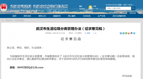 9月24日,武汉市司法局、武汉市政府法制信息网公布《武汉市生活垃圾分类管理办法(征求意见稿)》。该意见稿明确了生活垃圾分类责任,在分类标准、具体要求等方面,作出了明确规定。此办法一旦通过,意味着江城将由生活垃圾分类试点进入生活垃圾强制分类阶段。