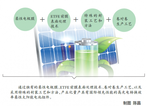 柔性太阳能电池片是桂裕鹏回国打造的重点项目,已申请国内外专利79项,其中发明专利28项,实用新型专利45项。公司通过独有的柔性电极膜、ETFE前膜表面处理技术、卷对卷生产工艺,以及采用特殊的封装工艺和方法,产业化量产具有国际领先性能的高光电转换效率柔性太阳能电池组件。