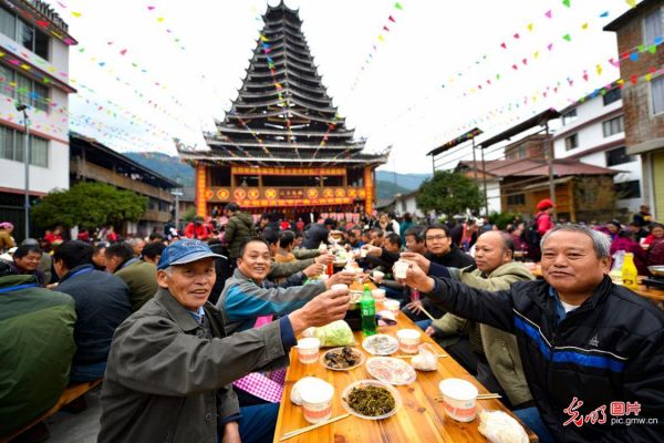 2019年11月26日,广西龙胜各族自治县平等镇广南村侗族同胞身着节日盛装,通过开展民俗巡游、舞草龙、歌舞表演、打年粑、吃百家宴等特色民俗活动欢度侗年。(潘志祥摄/光明图片)