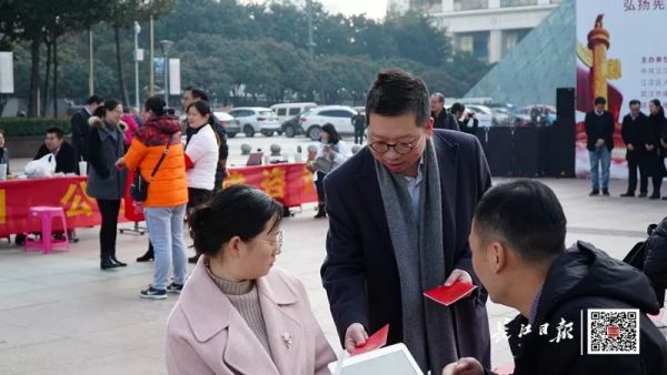 首届“十大基层法治人物”之一李涛律师在街头给市民发放宪法文本