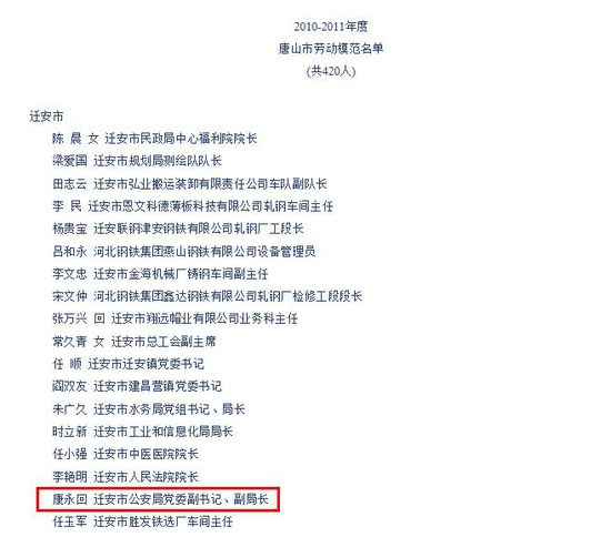图说:康永曾于2012年获“2010-2011年度唐山市劳动模范”称号。