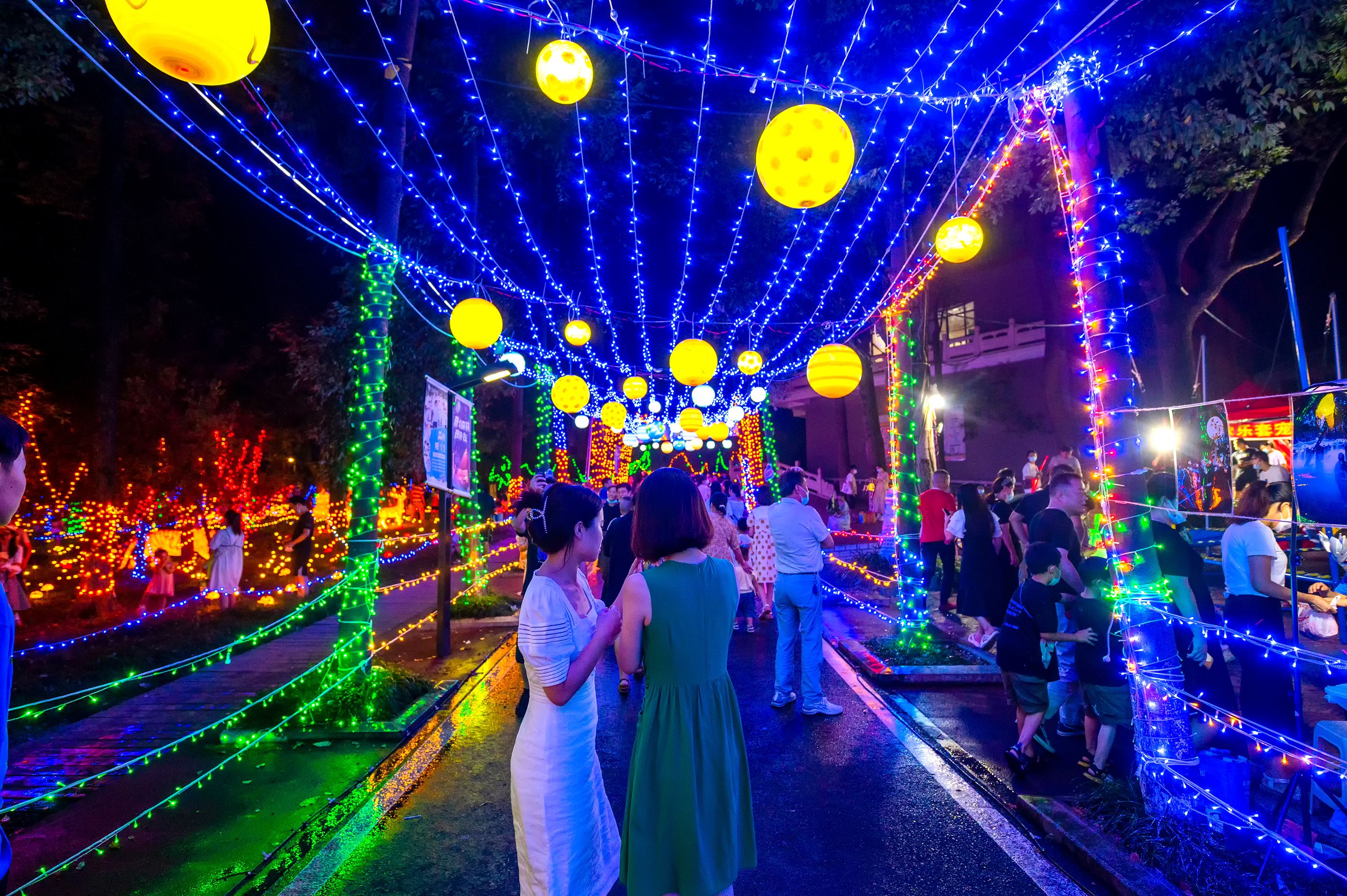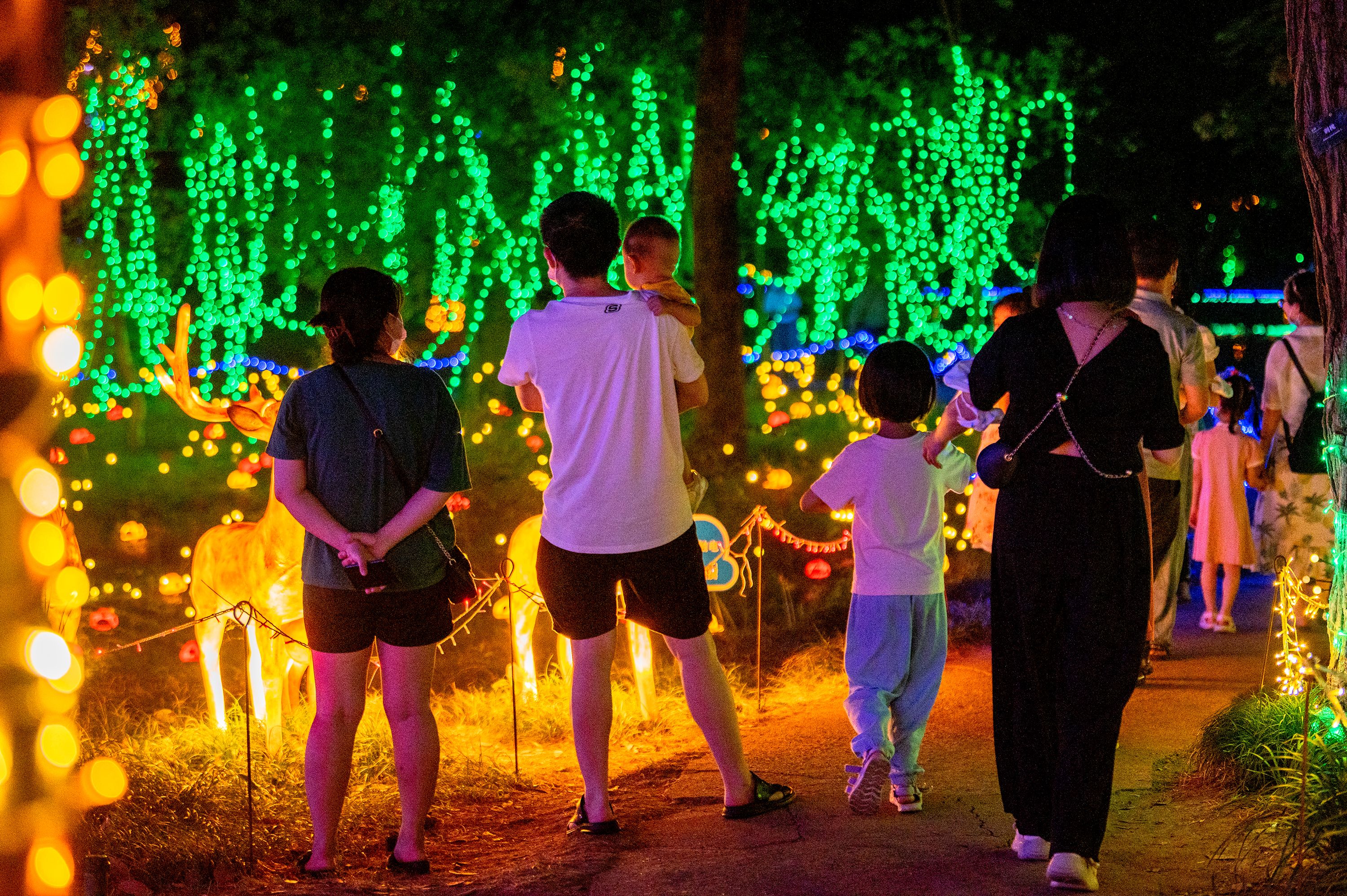 “太出片了!好像走进了童话镇。”游客们或穿行在水林草湖间,欣赏由灯光艺术、数字光影、激光、雾森等手段打造行星长廊、迷雾森林、植物光影秀等夜游景点;或在森林部落风营地,感受充满民族风情的户外露营,活力满满。