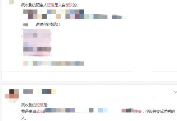 发出短信的人感受到释放内心郁结,接到短信的人则感受到鼓励。短信中由于明确发信人所在城市,也就出现了感谢武汉陌生人的消息。社交媒体上有人发表截图表达感谢,配文显示,短信接收人前往外地求学,寒冷冬季,接到来自武汉陌生人的短信,感到了家人般的温暖。