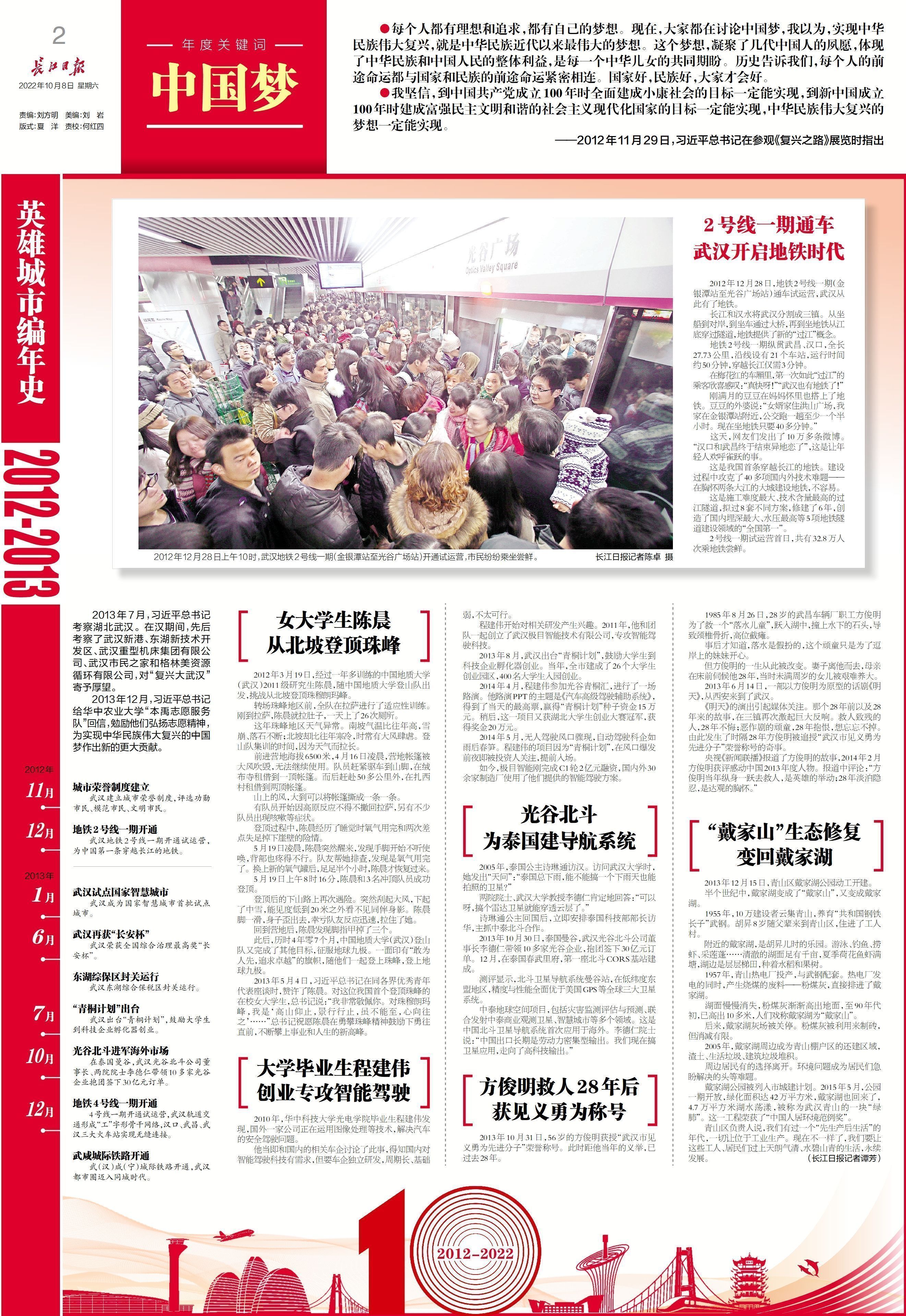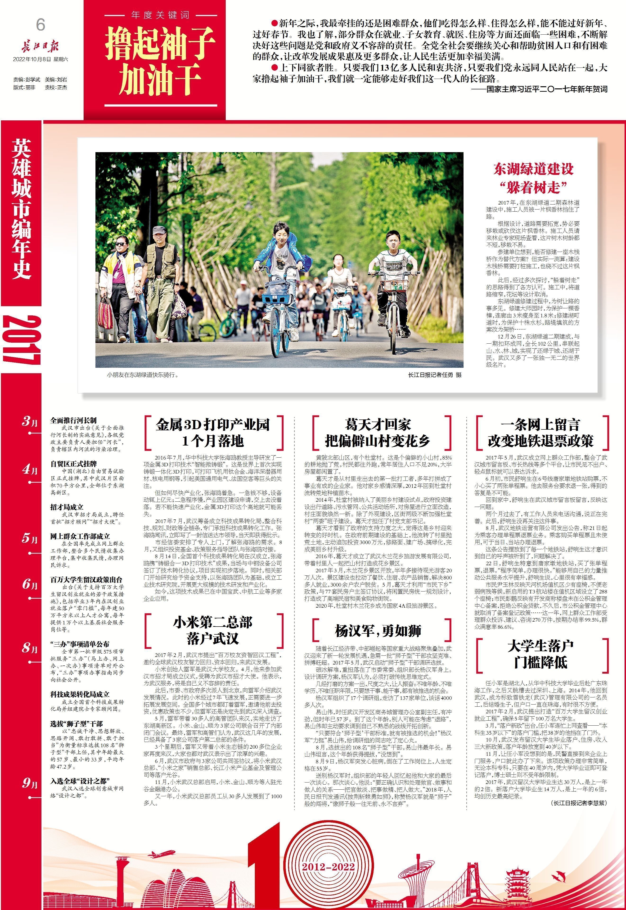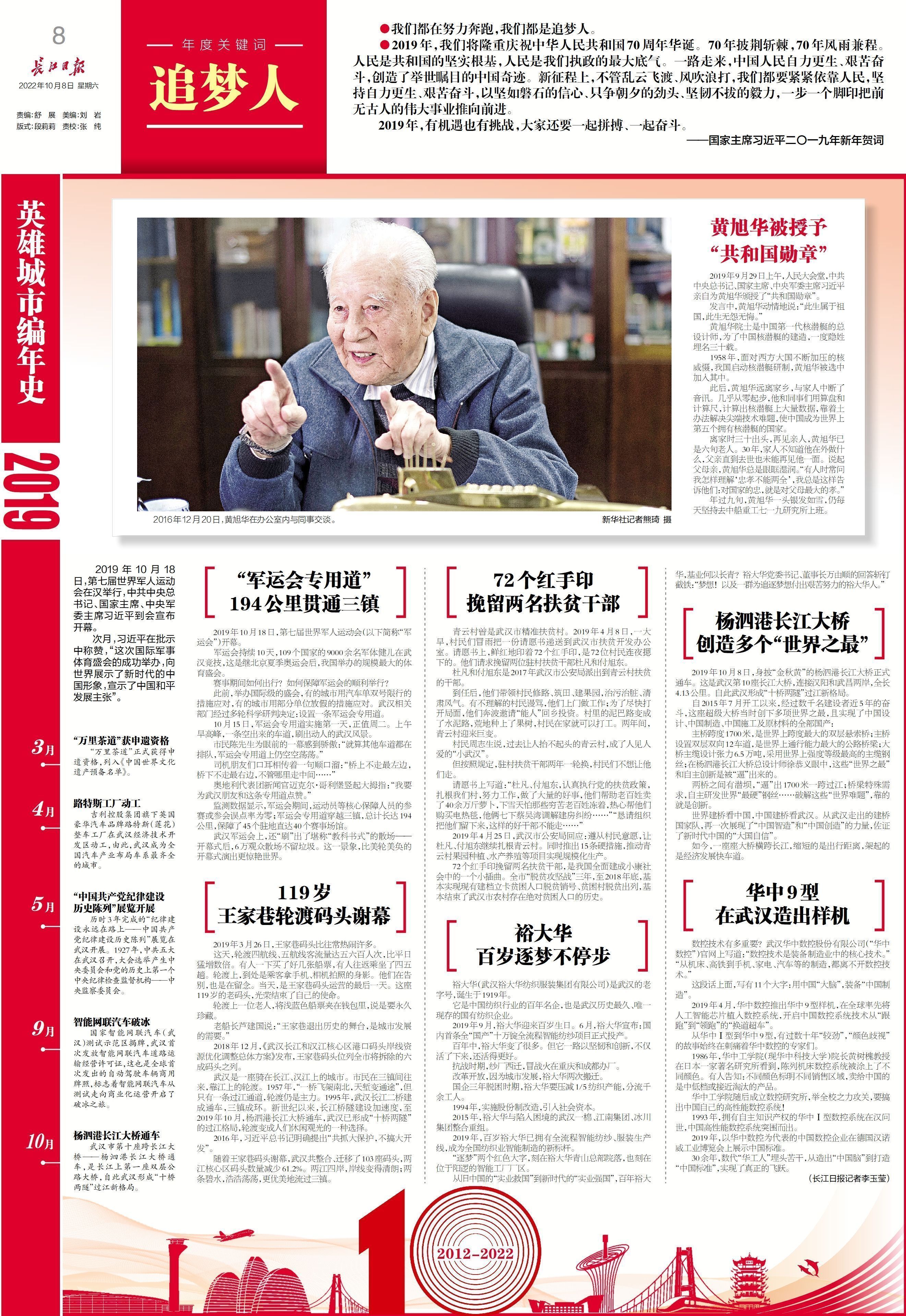 中华民族的伟大复兴,是中国每一个人的梦,需要每一个人的追梦,需要千千万万的英雄。“只要是有利于老百姓的事,我们就要努力去办,而且要千方百计办好。”十年坚守初心,十年无数奋斗,武汉的这些名字,铭刻在心——