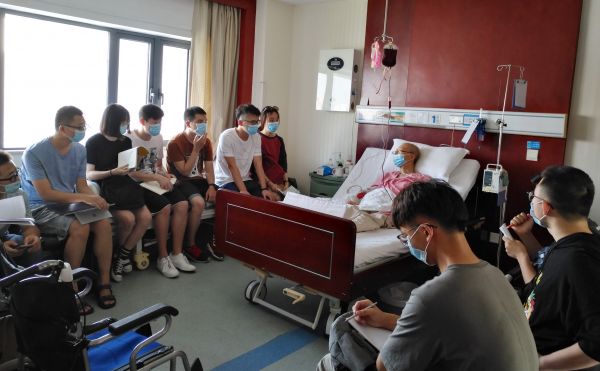 李德威在病床上召集学生开组会(2018年9月3日摄) 新华社发