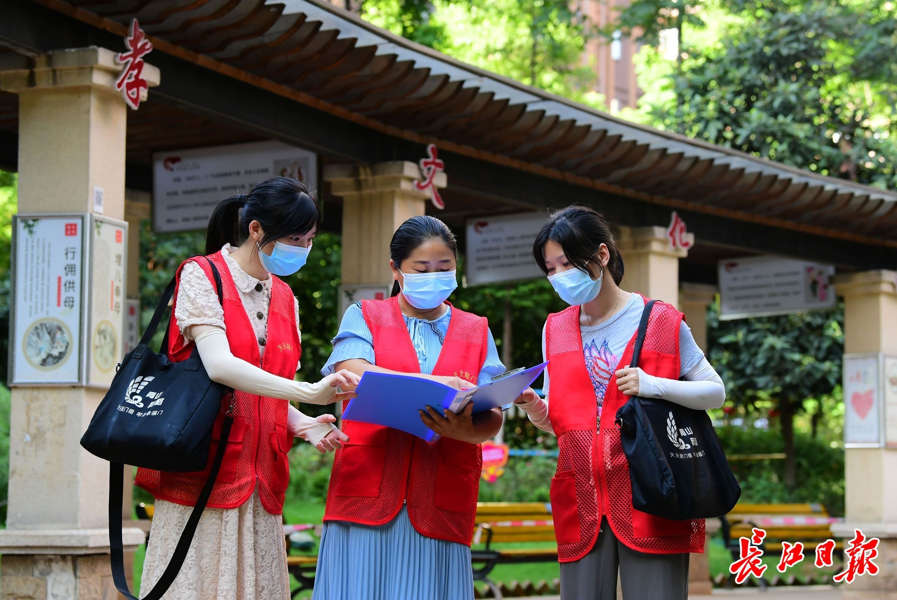 青和居社区“天天敲门组”成员交流上门看望高龄、独居、残疾老人的情况。长江日报记者刘斌 摄