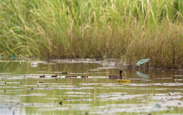 青头潜鸭雏鸟跟着妈妈遛弯。王汉 摄