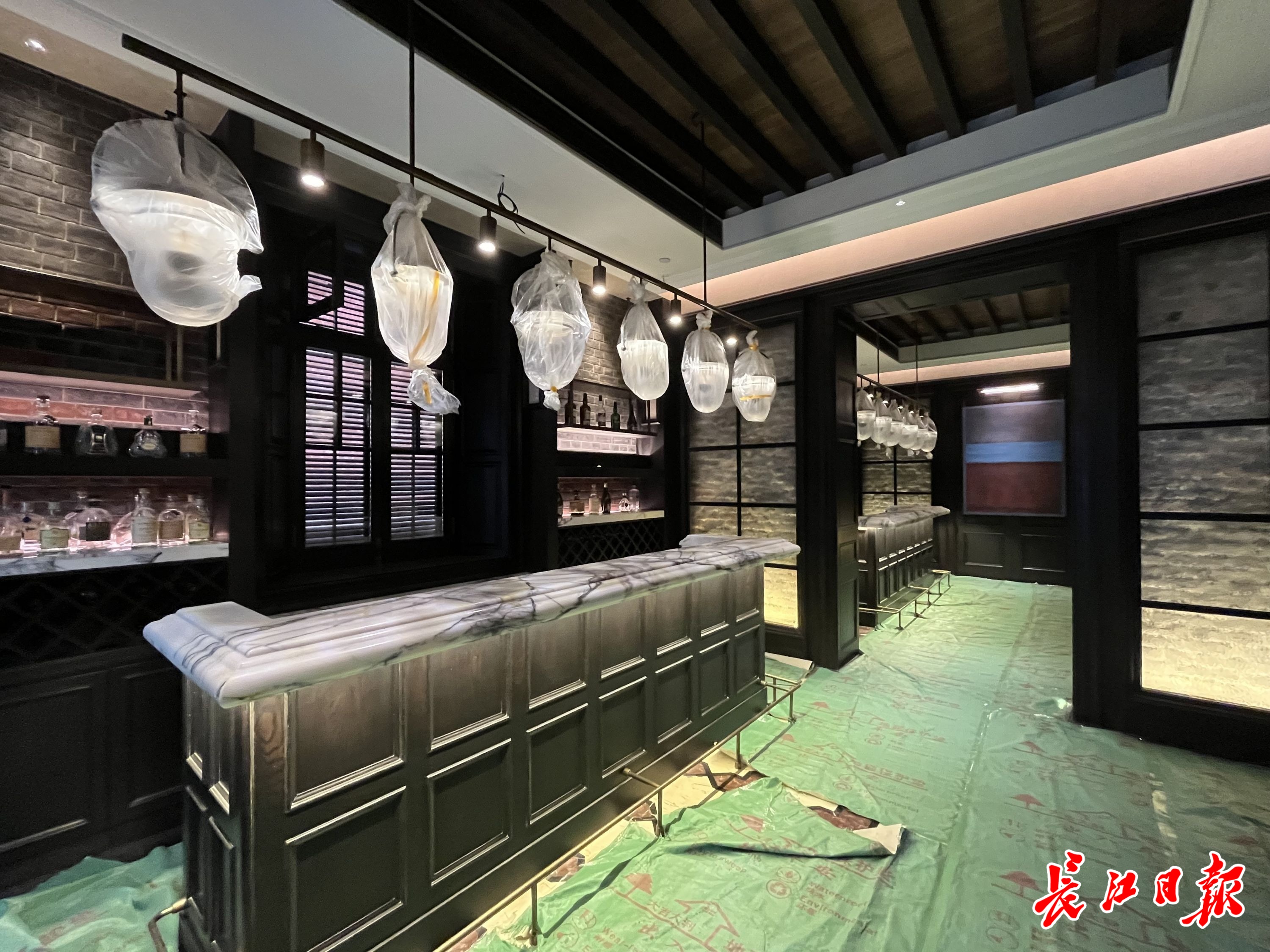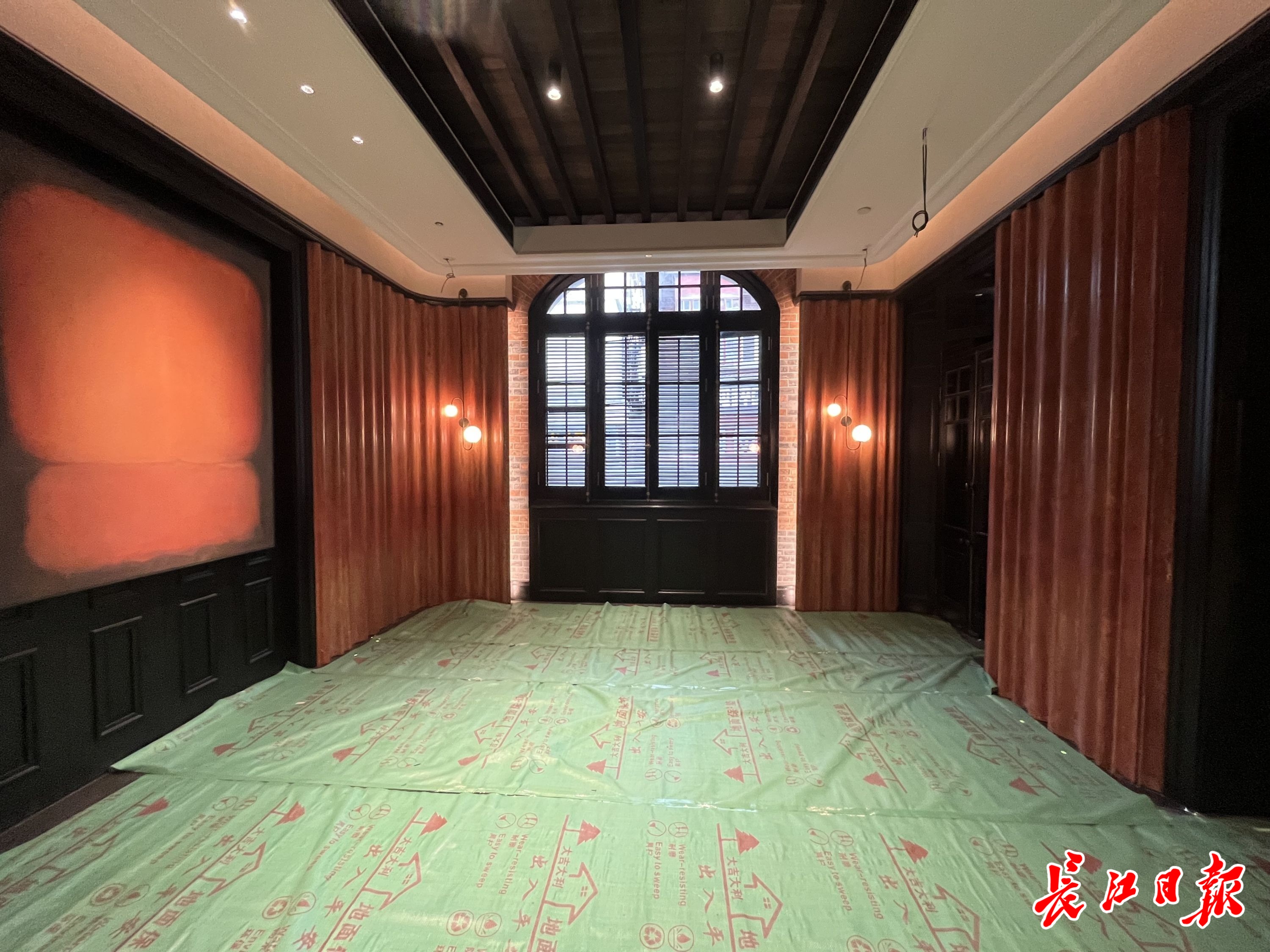 长江日报记者在巴公房子内看到,首次亮相的一楼的接待大厅和吧台区已经改造完工,2—4楼的客房区仍在修缮改造中。接待大厅以红洞石打造背景墙,异常醒目地映入眼帘,在暖黄的灯光下如同铺开层层红色帷幕,让人有种身处老上海影剧院的感觉;老照片里的斑驳木门,现在已整旧如旧,深褐色大门配上俄罗斯风格的铁艺把手及装饰,看上去古典中又带着大气与高雅。