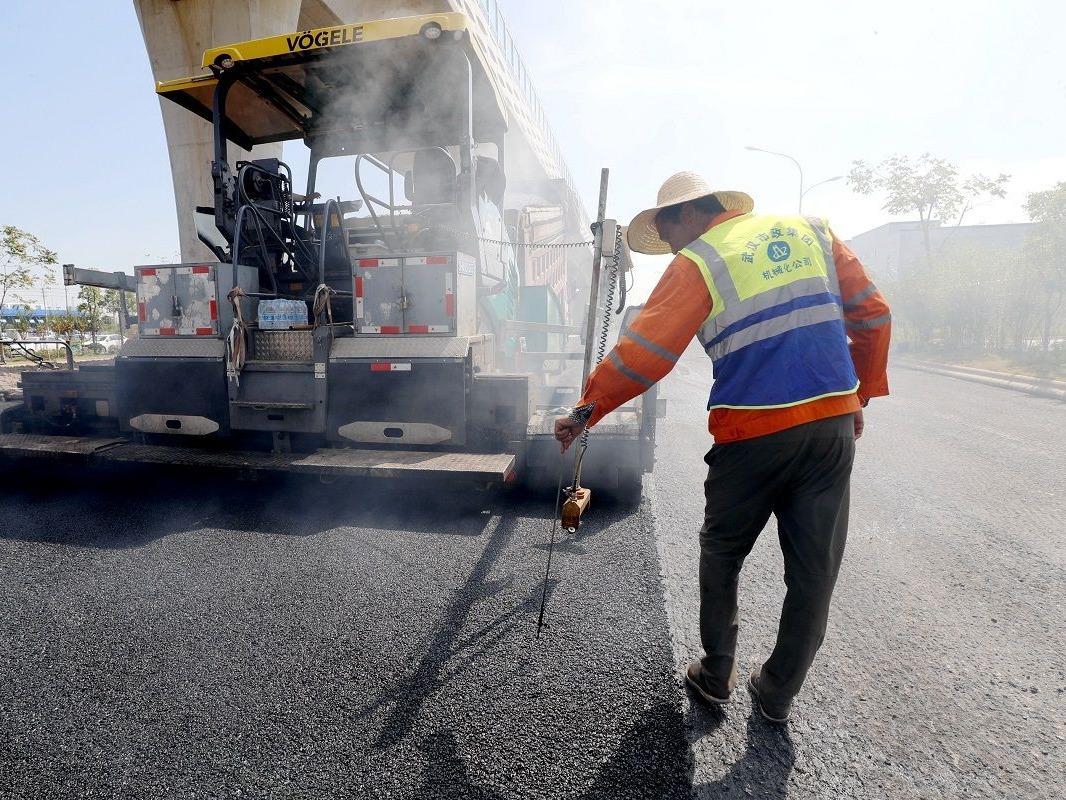 摊铺机作业时,施工人员测量铺设的厚度和平整度。通讯员袁永华 摄