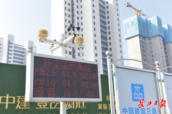 记者参观了中建三局集团有限公司承建的中建壹品澜庭项目,现场路面干净,秩序井然,不同于大家印象中尘土飞杨的建设工地。工地入口,立有一块扬尘监测系统显示屏,屏上有pm2.5、pm10、噪音的实时数值显示,走在工地上,时不时一阵水雾喷涌过来。据中建三局三公司该项目的项目经理张旭介绍,他们在现场安装了扬尘监控系统、实时监控预警,设置移动式炮雾、塔吊喷淋、移动洒水车等多个可移动使用的洒水降尘设备;设置围墙喷淋、外架喷淋、自动洗车台等多个固定式降尘、冲洗设备,“现场设置了130余个喷淋点,pm2.5值达到100ug/m³就会自动喷淋。这一套系统成本是7万元,和传统的人工接管、控制等喷淋方式对比,长期来说它是节约成本的。”