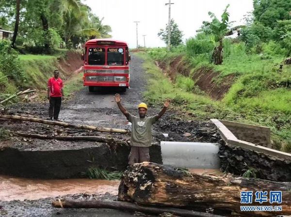 12月28日,在斐济瓦努阿岛兰巴萨的一个村庄,道路上的简易桥梁被洪水冲垮。