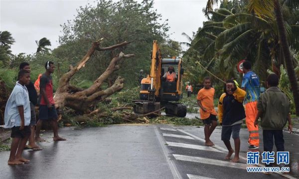 12月28日,在斐济瓦努阿岛兰巴萨,斐济道路管理局工作人员清理倒在公路上的树木。 新华社发(《斐济太阳报》提供)