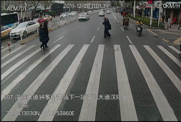 车载监控视频显示,12月28日11时01分30秒,武汉公交607路37岁的女司机曾燕,驾驶着549号车快到汉阳大道钟家村公交车站时,在附近一处斑马线上停车礼让行人。正在这时,车前方一位年约70岁的盲人站在斑马线外,手拄着拐杖想过马路,但显得有些犹豫不决,一时不知所措。