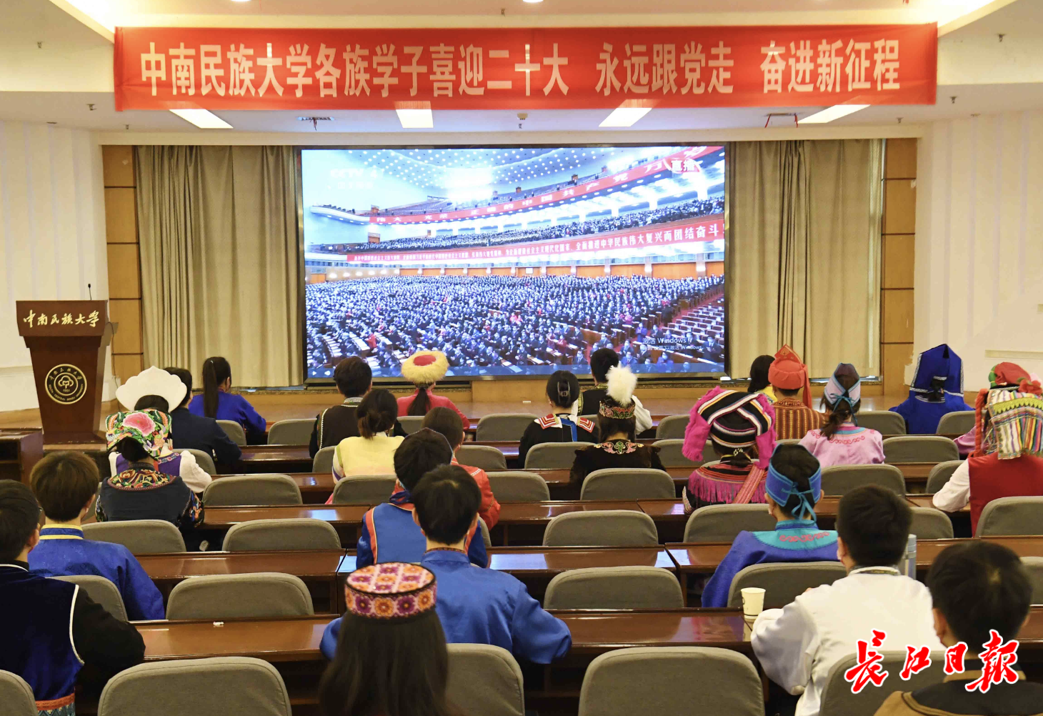 中南民族大学各民族学生收看党的二十大开幕会直播。 长江日报记者高勇 摄