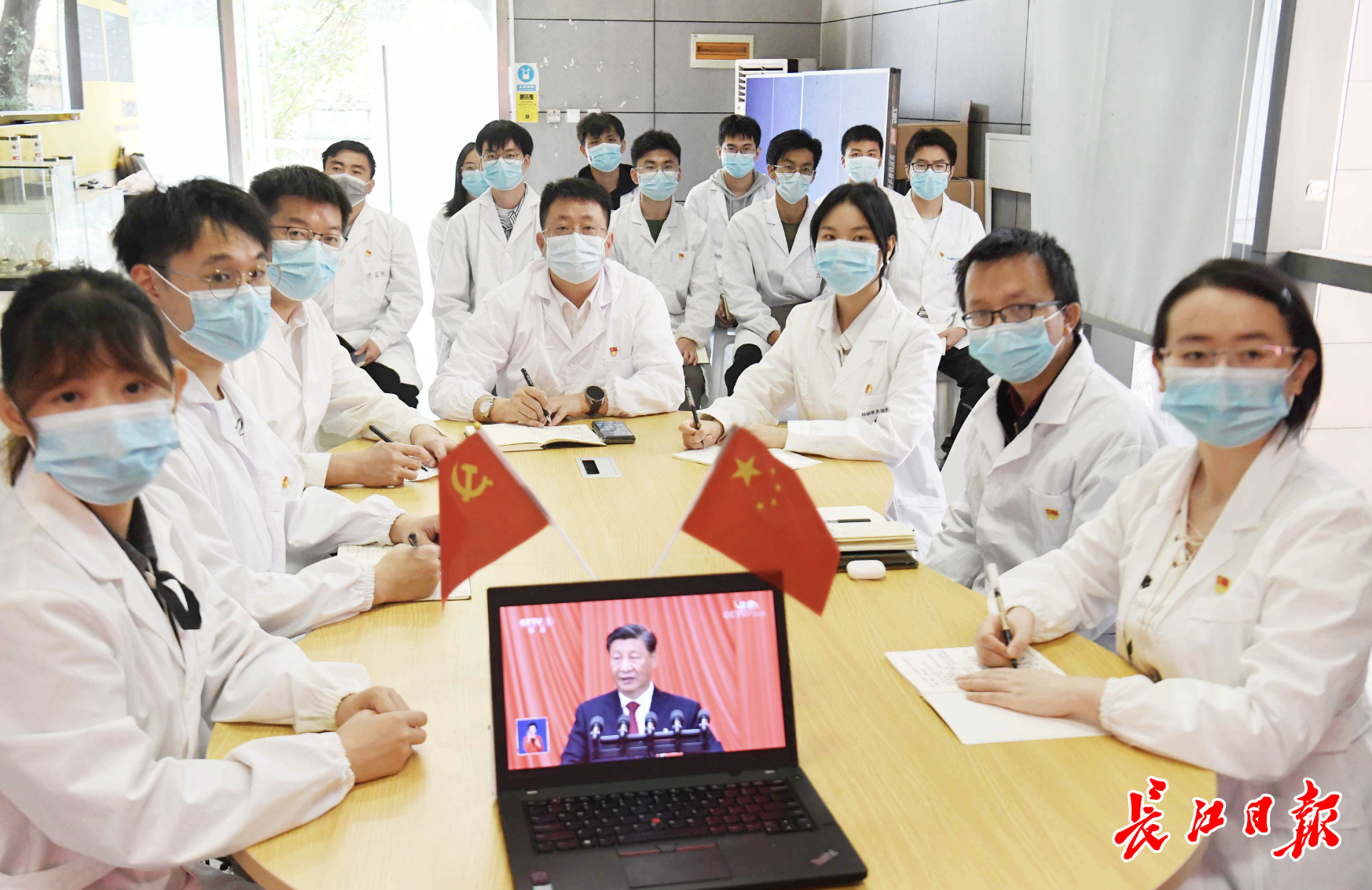 武汉理工大学材料科学与工程学院麦立强团队研究生党支部集体收看党的二十大开幕会直播。长江日报记者高勇 摄
