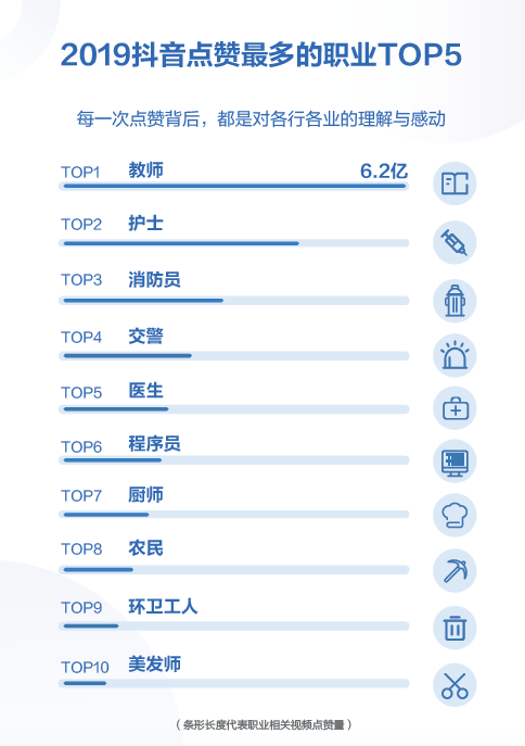 各行各业的工作者也在记录工作点滴,根据报告,2019年抖音上点赞最多的职业有教师、护士、消防员、交警、医生,每一次点赞背后,都是对各行各业的理解与感动。抖音用户@黑河三炮 是黑龙江省救援消防总队黑河支队的一名消防员,他在抖音上记录自己的工作与生活,也为网友科普消防知识。