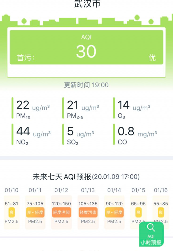 拥抱蓝天APP由武汉市生态环境局开发,显示了空气质量指数(Air Quality Index)及其PM10、PM2.5、二氧化氮、臭氧、二氧化硫、一氧化碳等有害气体的含量,并公布了武汉市不同监测点数据。