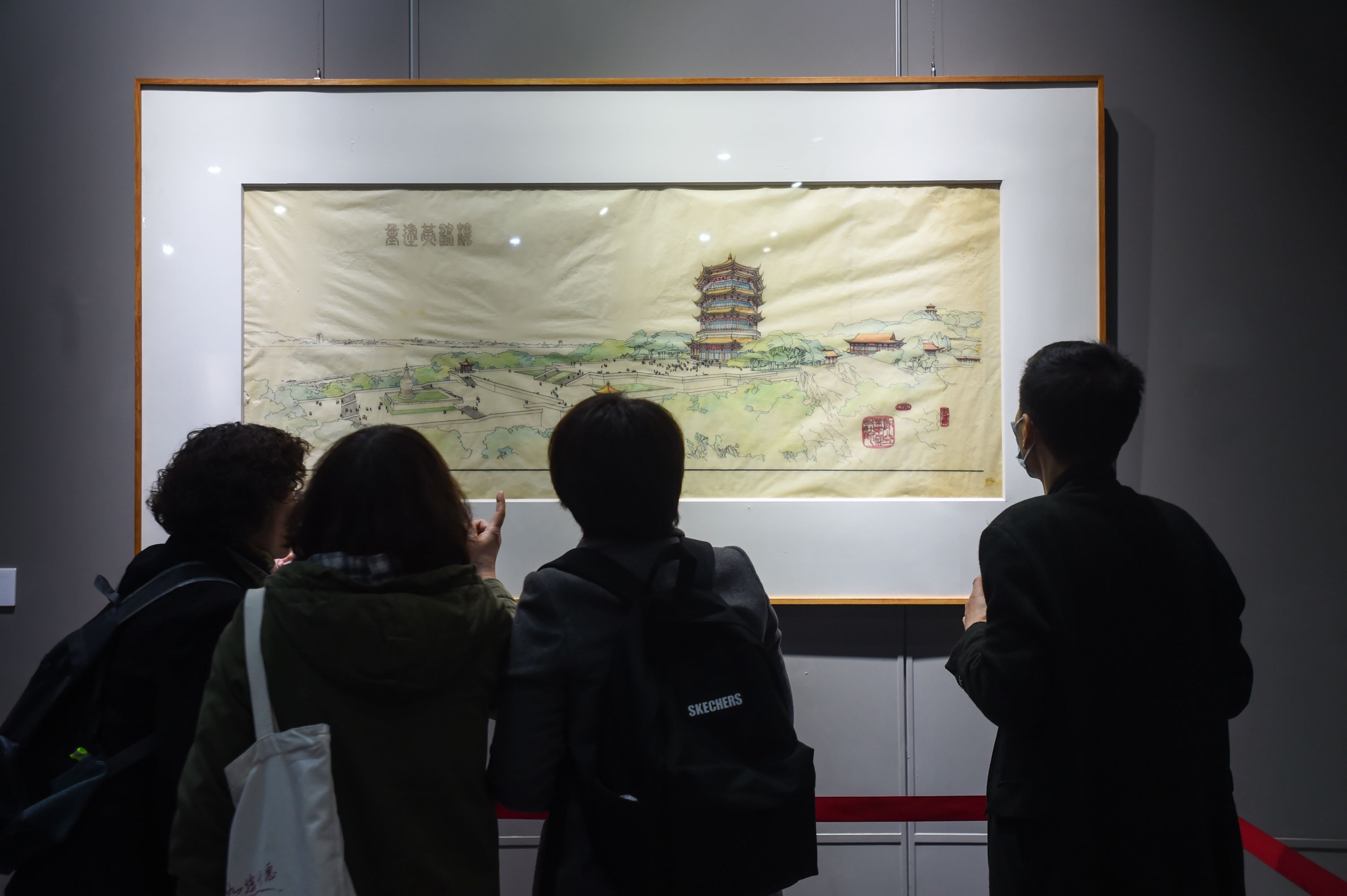 游客观看黄鹤楼重建工程总设计师向欣然作品回顾展。 许魏巍 摄