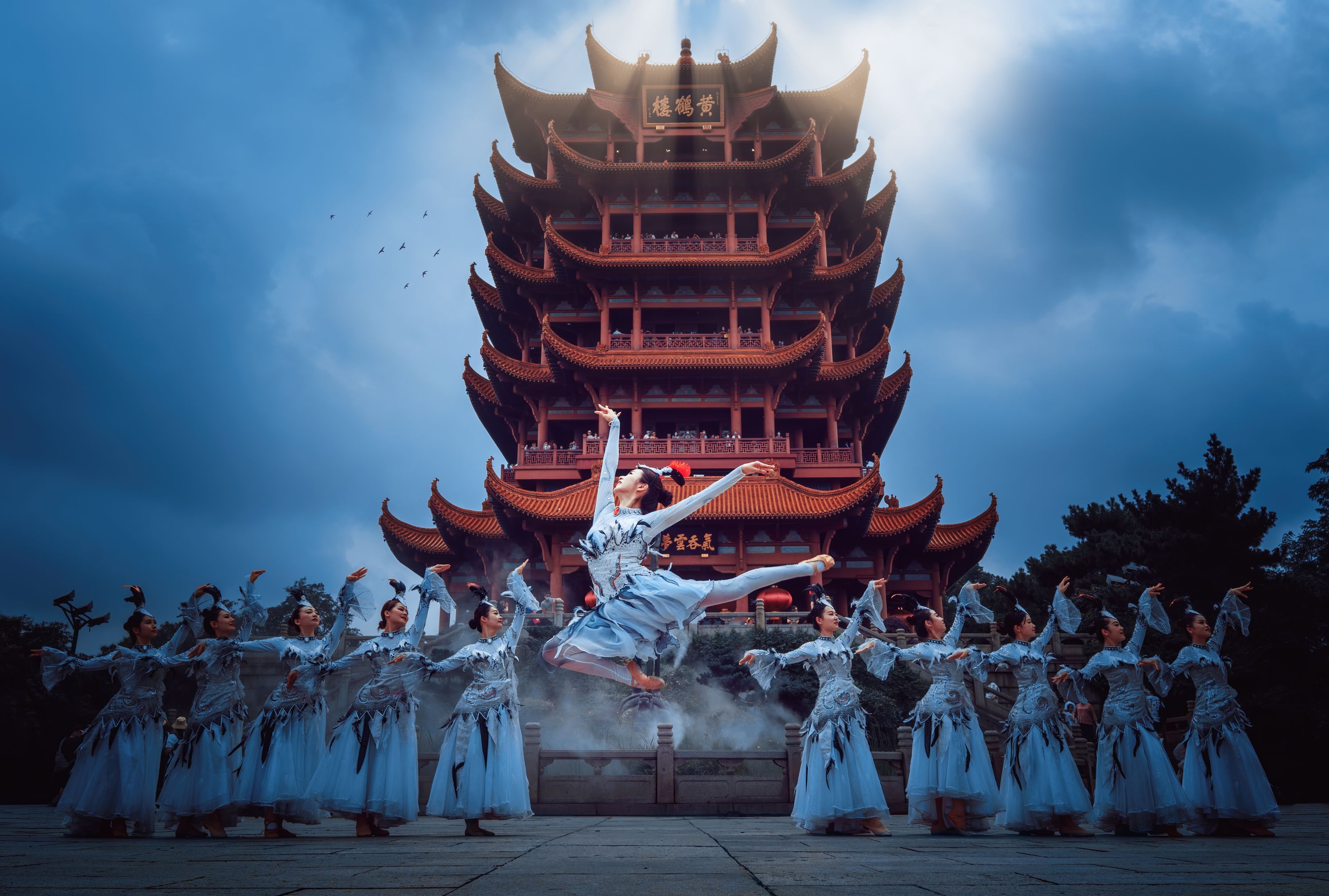 回味着唐乐,再登上蛇山,由舞者扮演的群鹤翩翩起舞,喜迎八方来客。主楼西广场前,云雾缭绕,白鹤缓缓现身,回首间,清风拂袂,眼神如盈盈清波。仙道与白鹤共舞,古代与现代相遇。游人在这场大型迎宾乐舞中不仅能得到美的体验,还能从中窥见千年古楼所承载的文化与内涵。