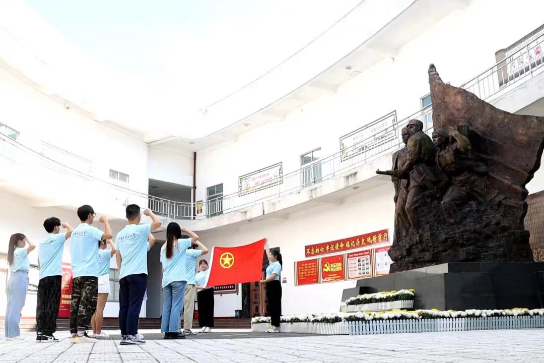 中南财经政法大学“红星筑梦工商队”成员在纪念馆内苟在合烈士雕像前重温入团誓词。 通讯员宗南大 摄