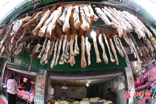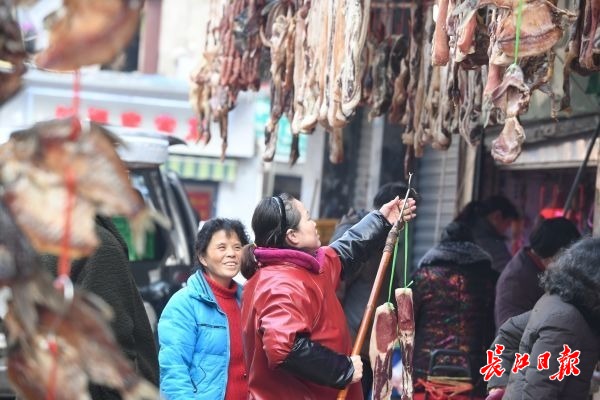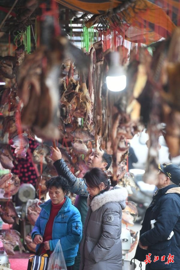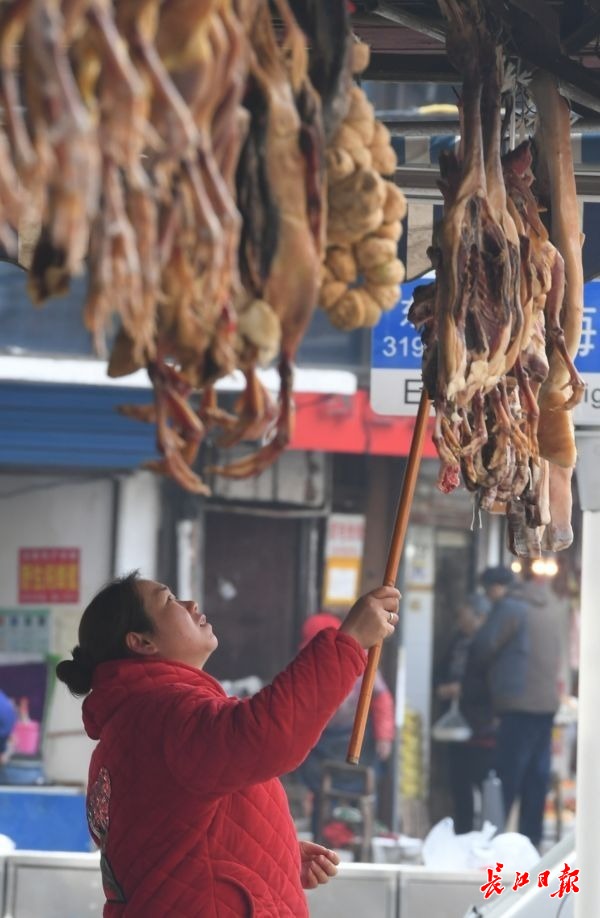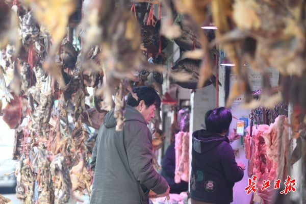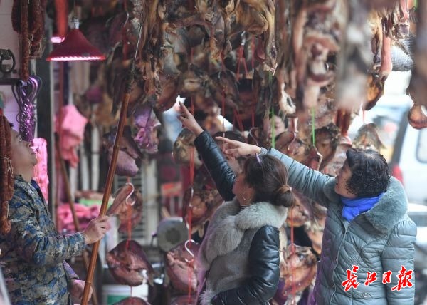 长江日报-长江网1月20日讯 20日,武汉汉口长春街临街商铺门口挂满了香喷喷的腊肉、酱鸭、香肠等美食,前来购买的市民络绎不绝,为即将到来的春节购置年货。街头洋溢着喜庆祥和的节日气氛。这些无比亲切的味道,时刻提示着大家:年将至,腊味香,又到团圆时。(记者李子云 摄影报道)