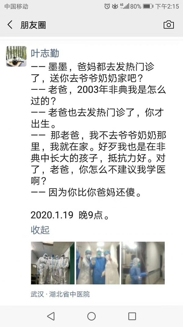在自己的朋友圈里,叶志勤记录下19日他与孩子的对话。2003年,叶志勤也在抗击非典疫情的一线工作,那一年,孩子刚刚出生,如今,他与妻子共同站在了抗击疫情的一线。