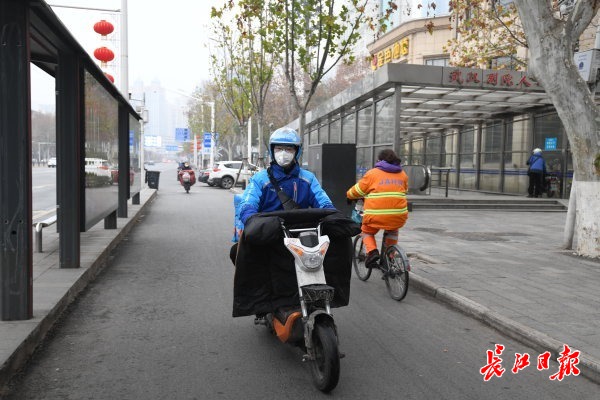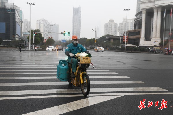 长江日报-长江网1月23日讯 1月23日,下午4点,在汉口建设大道至江汉路,长江日报-长江网记者一路骑行,看到路上环卫工人、外卖小哥、送气工人依然忙碌在各自的工作岗位上,没有丝毫懈怠,每个人都在保证大武汉的正常运转。记者詹松 摄影报道