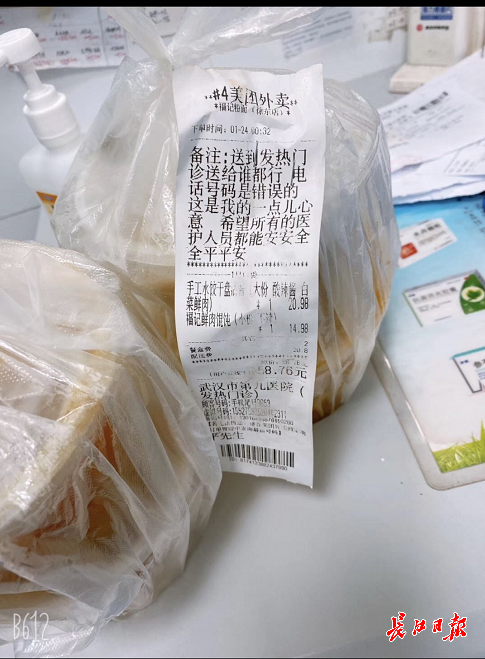 24日凌晨医院收到了这样一份来自民众的关怀——外卖小哥送来了不知名人士送的水饺馄饨等食物。留言写道:“送到武汉市第九医院发热门诊,给谁都行,电话号码是错误的,这是我的一点儿心意,希望所有的医护人员都能安安全全、平平安安!”朴实无华的话语、小小的举动温暖了寒夜的医护人员,让门诊忙到深夜的医护人员热泪盈眶。(记者毛茵 通讯员刘颖栗 柴莹莹)