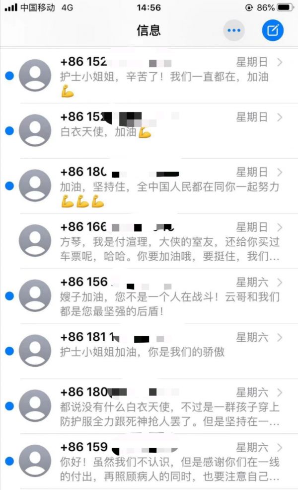 “加油!你不是一个人在战斗!”“辛苦了,一切都会好起来的,要照顾好自己!”“你有一个好老公!”…… 初一下午交班时,蒋方琴才取回手机,发现竟收到了100多条短信,虽然来自不同的地方,多数人素未谋面,却让她重拾力量和勇气,“大部分是给我加油打气的,还有给我讲笑话的,想让我开心。”蒋方琴说,她认真阅读了每一条短信,感觉安心多了,也特别感动。