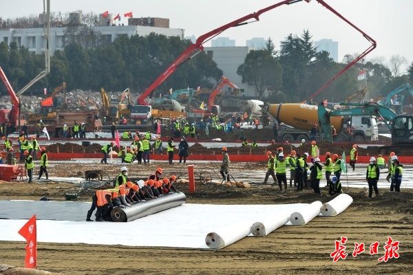 除夕,位于蔡甸区知音湖大道的武汉火神山医院如火如荼建设中。为解决现有医疗资源不足问题,武汉市参照北京小汤山医院模式建设火神山医院,可容纳1000张病床,将在2月3日前建成。之后,武汉又新建雷神山医院,病床约1600张。