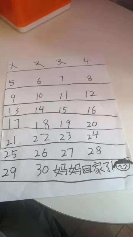 “再过30天,妈妈就能回家了,现在已经划掉3天了”