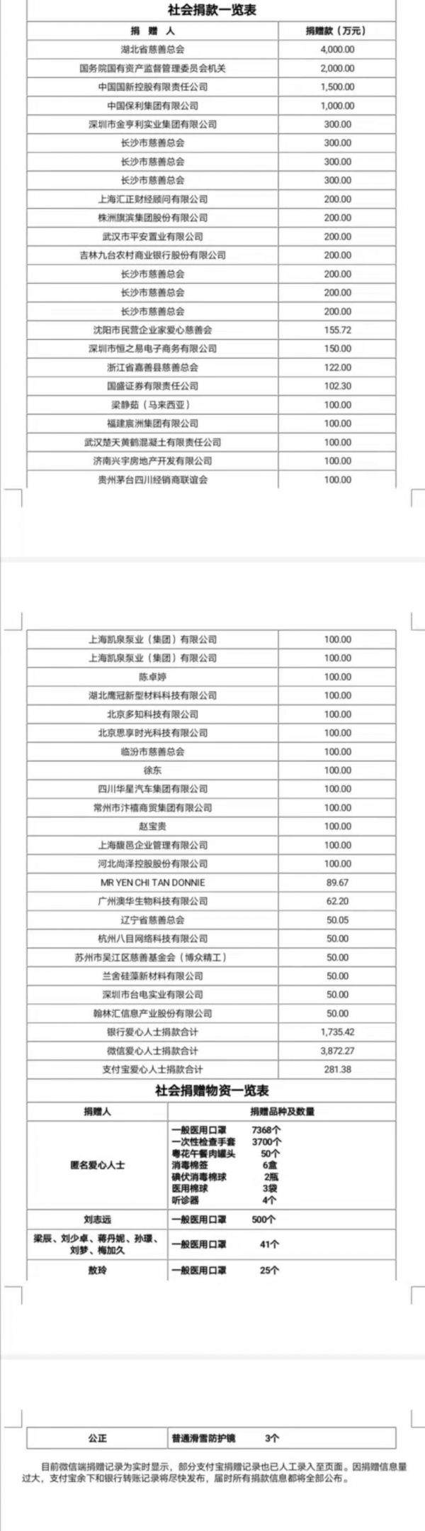 长江日报—长江网2月1日讯(记者杨帆 通讯员张芳)自1月23日,武汉市新型冠状病毒感染的肺炎防控指挥部发布第4号通告以来,武汉市慈善总会负责接受捐款和通用物资。现将1月31日至2月1日市慈善总会接受捐赠款物公示如下(具体款物使用和分配方案随后公布):