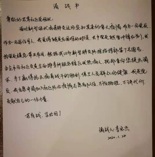 社区党员李宏杰写的请战书
