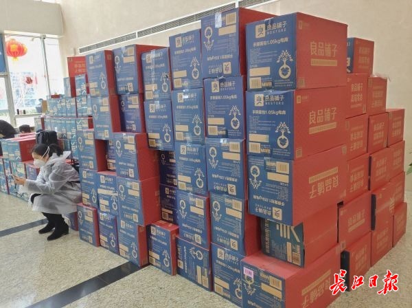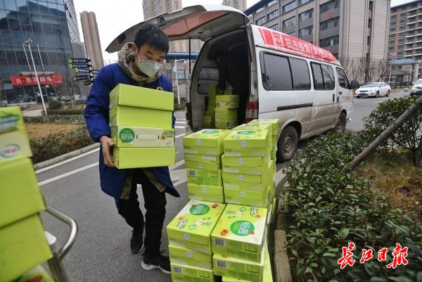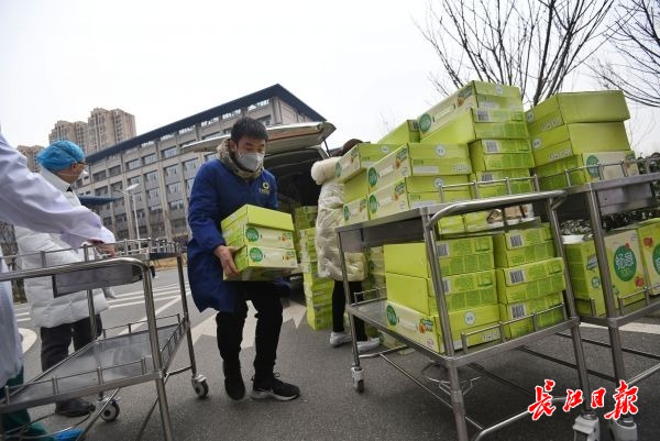 武汉大学附属省人民医院佛祖岭东院区,430箱牛奶饮品送抵病房楼下。