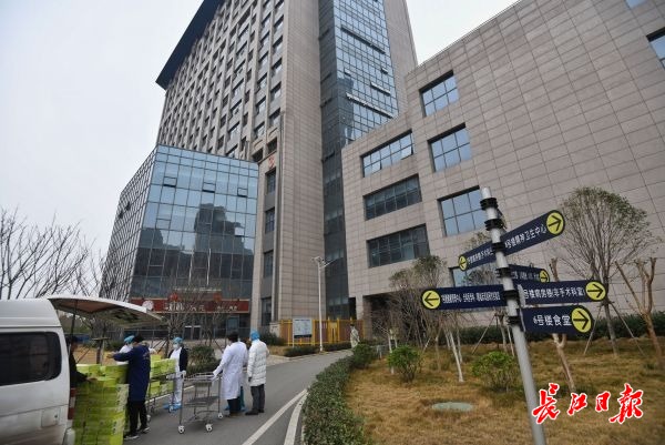 2日,武汉大学附属省人民医院佛祖岭东院区,医护人员上前领取饮品。