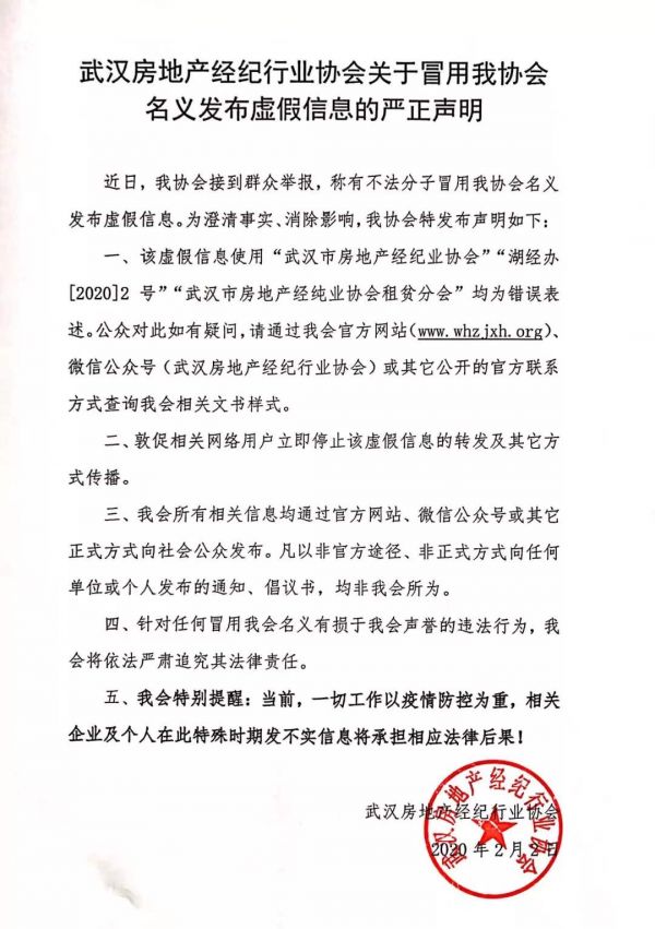 “一、该虚假信息使用“武汉市房地产经纪业协会”“湖经办[2020]2号”“武汉市房地产经纯业协会租贫分会”均为错误表述。公众对此如有疑问,请通过我会官方网站(www.whzjxh.org)、微信公众号(武汉房地产经纪行业协会)或其它公开的官方联系方式查询我会相关文书样式。