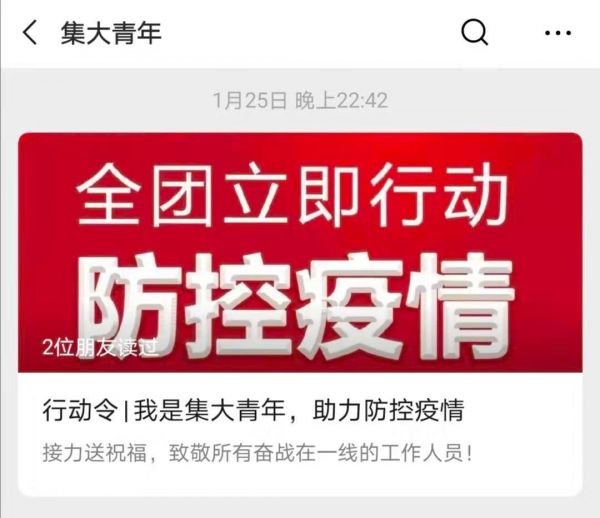 1月25日,在收到团中央和团省委的行动令后,学校当晚第一时间部署落实,动员集大青年开展接力送祝福的网络行动,积极发声,搭建起集大团员青年用赤子心表达爱国情的精神家园,凝聚起致敬一线工作人员、祝福武汉人民、祈愿祖国康泰的舆论正能量。