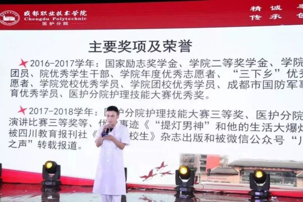 唐鑫元,男,共青团员,1996年出生,汉族,2016年毕业于乐山市嘉州卫生职业学校,同年9月以优异的成绩进入到成都职业技术学院护理专业学习,担任医护分院学生会主席、班级班长。