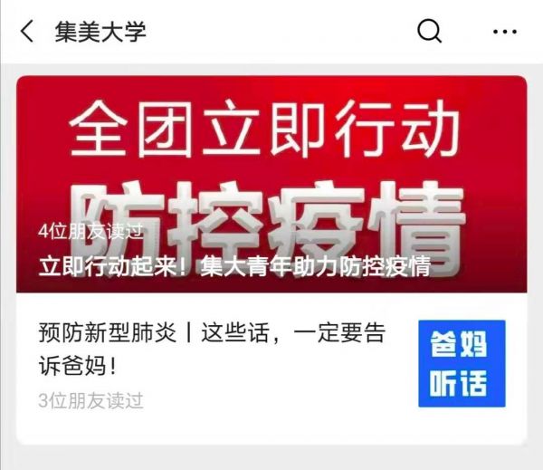 此外,学校先后在“集大青年”微信公众号等团属新媒体阵地推出十六期疫情防控专题;开启集大青年“毅”起防疫——20 天家庭健康生活的打卡活动,鼓励学生坚持乐观积极的心态和健康向上的生活方式应对疫情防控。