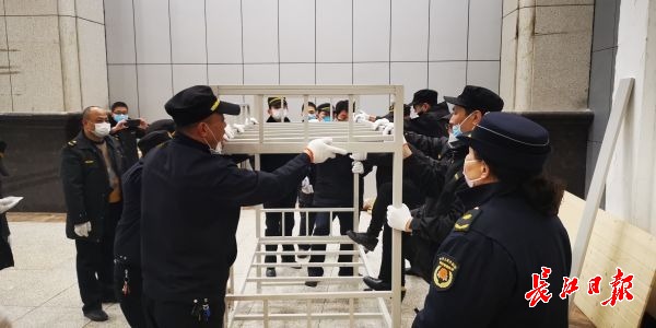3日晚,江汉区城管执法队也派出了60名队员,在会展中心内搬运病床。